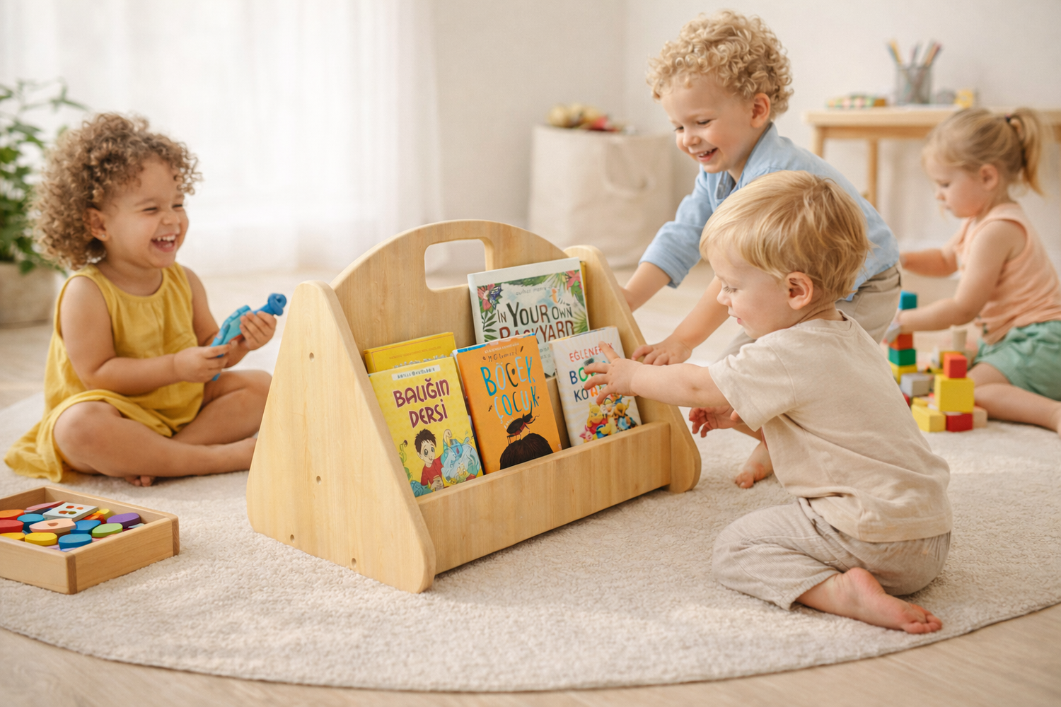 Pürüzsüz CNC kesim kenarlar, doğal yüzey dokusu ve hafif yapı sayesinde çocuklar kitaplarına korkmadan ulaşır.